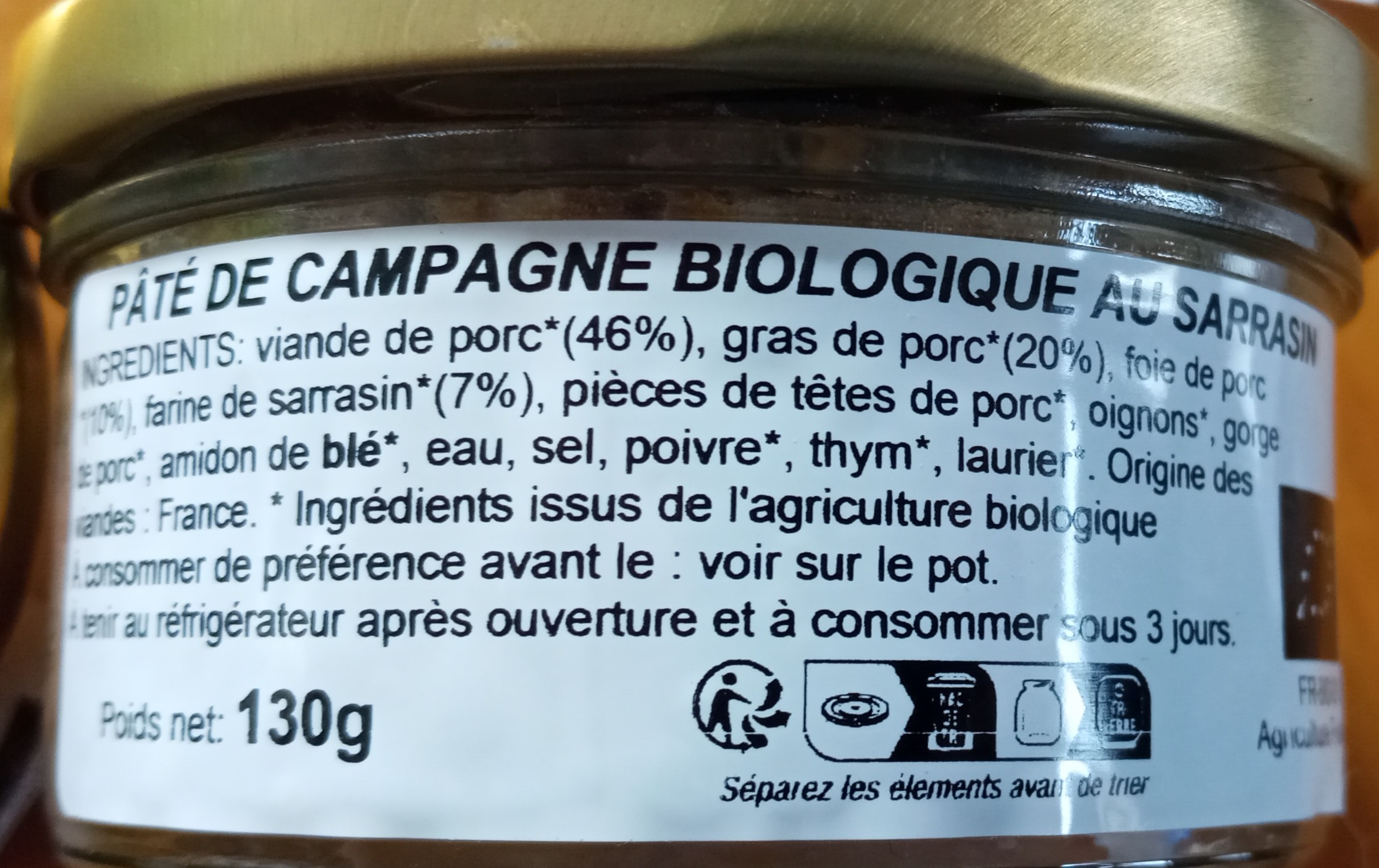 Délicieux pâté de porc bio et local aromatisé au sarrasin, pâté 100% breton ! Parfait pour accompagner vos apéros ou pique nique. A conserver au réfrigérateur après ouverture et à consommer dans les 3 jours. Prix au kilo : 33.34€